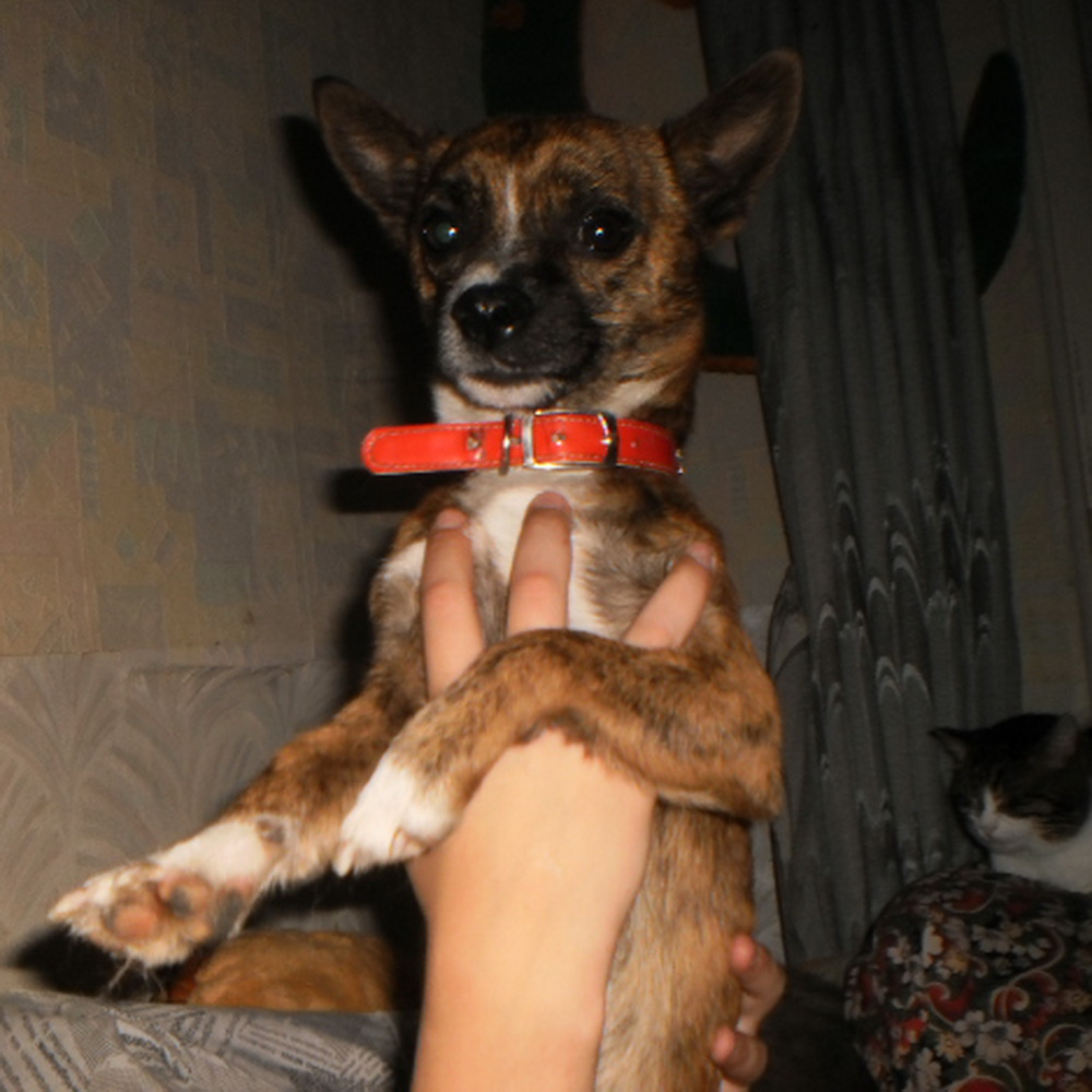 Поиск старых хозяев результата не дал,поэтому присматриваем новых хозяев. ФИЛИППОК - мелкий интересный парнишка.Когда стоит рядом с котом почти наравне по размеру. По характеру не злой,спит на кровати с кошками,не задиристый ровно дышит к собакам, даже к кобелям. Приучен к ошейнику,но иногда метит дома.Предпочитает натуральную пищу (приучаем к сухому корму). Возраст 1-3 года.Умеет типа охранять(заливается лаем) . Кастрирован,чипирован 8950 193 76 62.